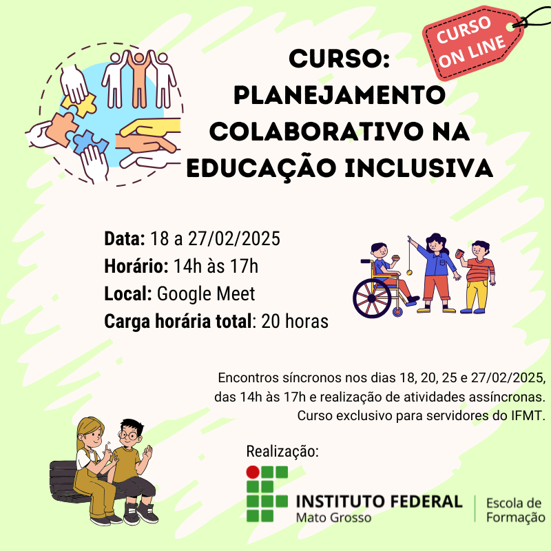 O curso tem como objetivo a capacitação de servidores do IFMT para desenvolver práticas de planejamento colaborativo, promovendo a inclusão de todos os estudantes. O curso visa fortalecer a atuação em equipe, a construção de estratégias pedagógicas acessíveis e a criação de um ambiente escolar mais equitativo e participativo.