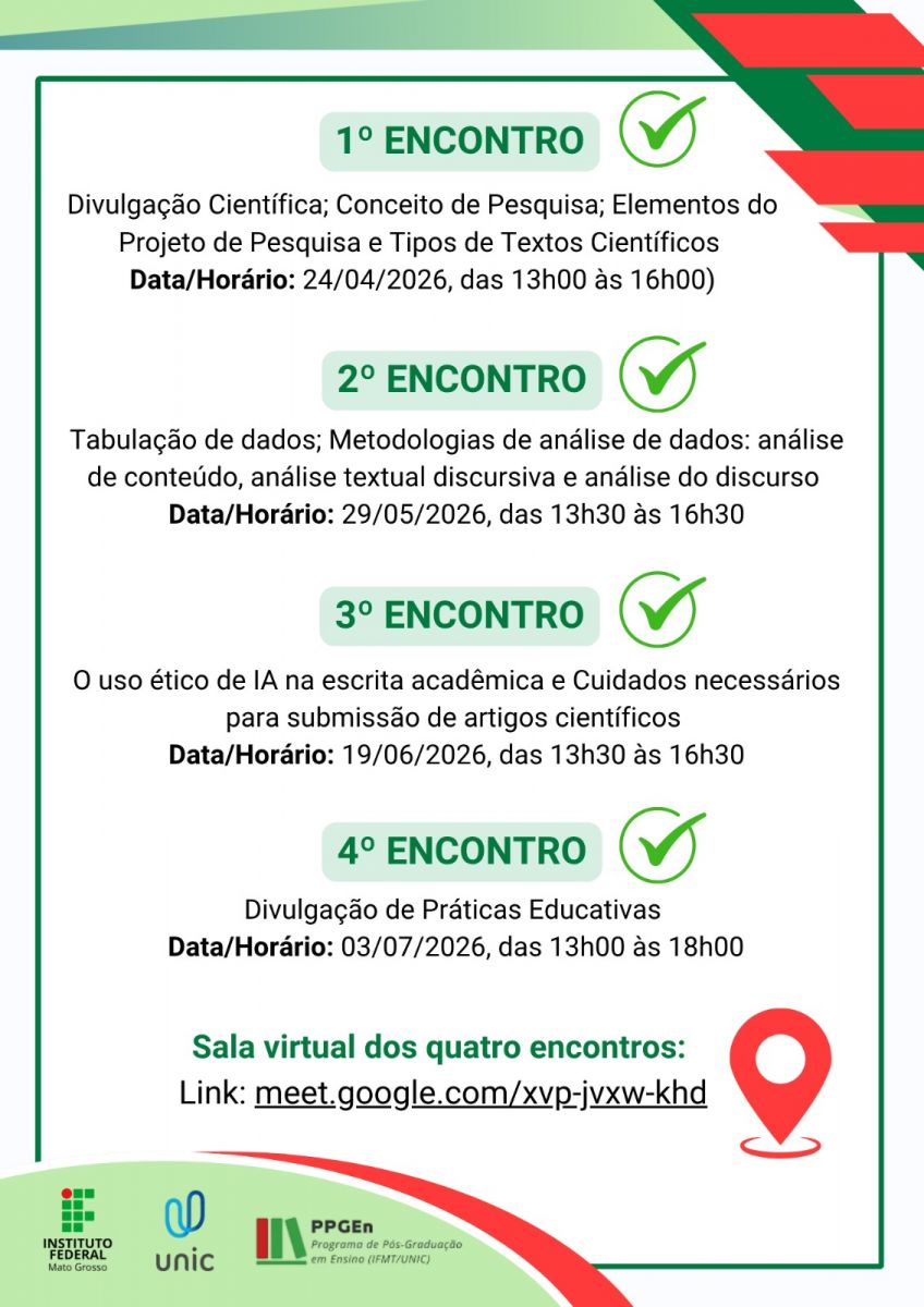 1º Encontro: Divulgação Científica; Conceito de Pesquisa; Elementos do Projeto de Pesquisa e Tipos de Textos Científicos (Quando: 24/04/2026, das 13 h às 16 h)