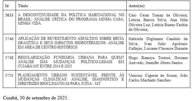 A relação das submissões aceitas está disponível no link do evento - menu superior Submissões - Resultados, ou pelo link: https://eventos.ifmt.edu.br/eventos/1047/SHISMT2025/resultados/