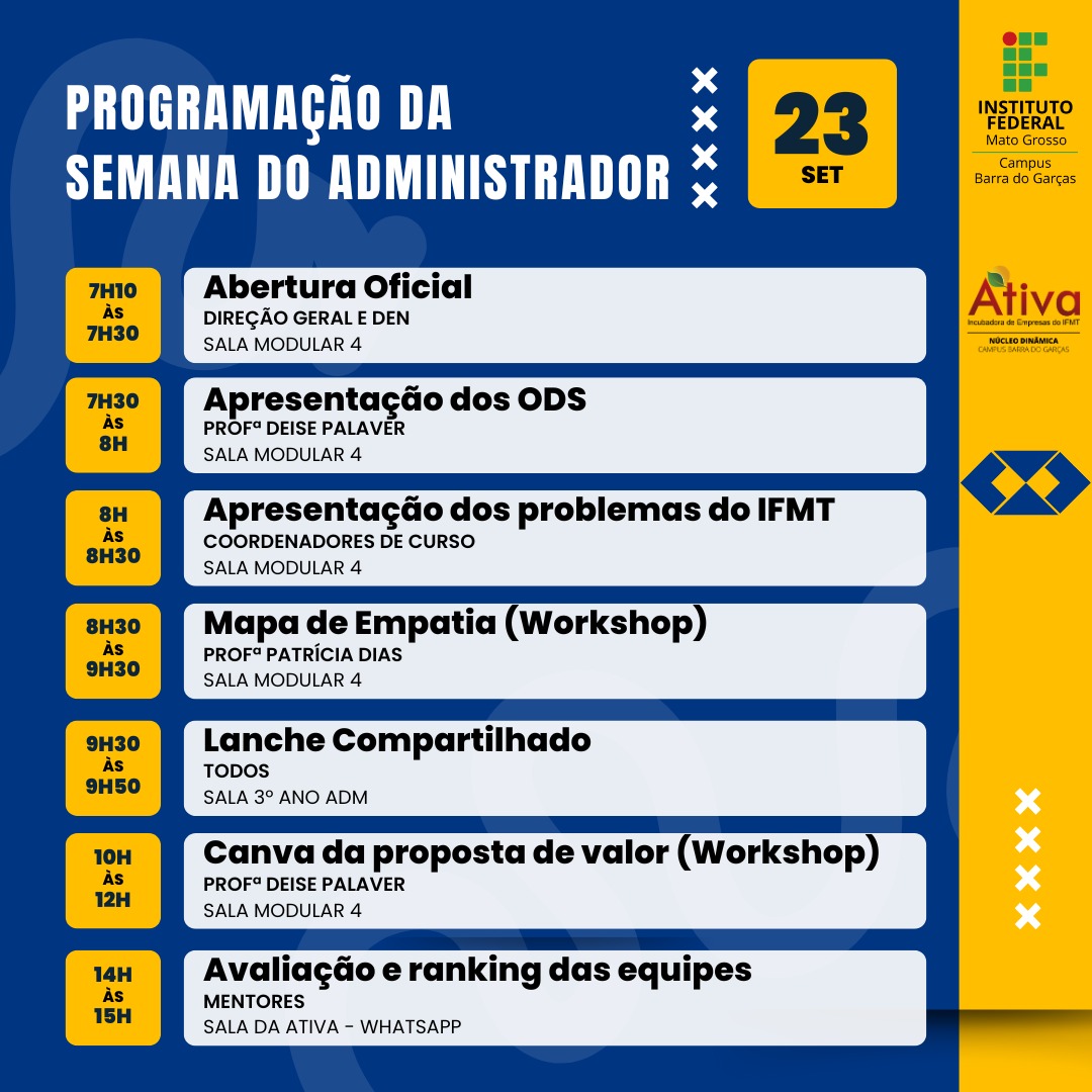 A semana terá início com a aplicação da OLITEF (Olímpiada do Tesouro Direto) e uma palestra sobre Educação Financeira, além de um momento de integração com lanche compartilhado.