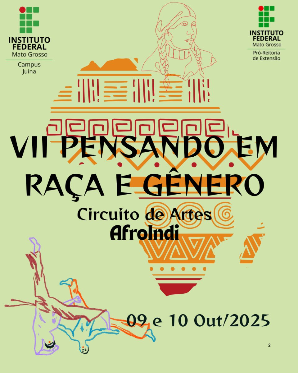 Entre os dias 09 e 10 de outubro de 2025, o IFMT – Campus Juína promoverá dois eventos de grande relevância acadêmica, cultural e social: o VII Pensando em Raça e Gênero no IFMT e o I Circuito de Artes Afro-Indígena. Essas iniciativas têm como objetivo fortalecer o diálogo sobre diversidade étnico-racial, igualdade de gênero, combate ao racismo e à intolerância religiosa, além de valorizar as expressões artísticas afro-brasileiras e indígenas.
