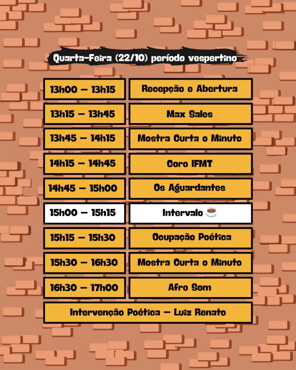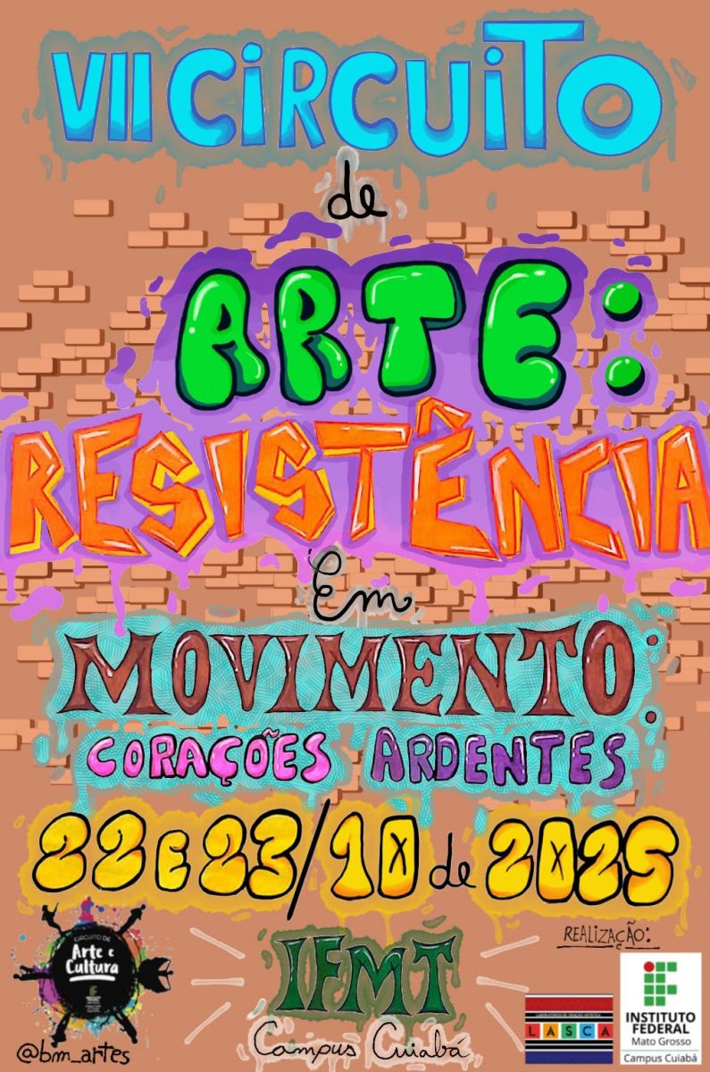Nos dias 22 e 23 de outubro de 2025, o IFMT Campus Cuiabá realizará o 7º Circuito de Arte e Cultura – Resistência em Movimento: Corações Ardentes, um evento cultural que celebrará a Arte em suas diversas formas, promovendo a integração entre estudantes, servidores e a comunidade externa. O evento é uma oportunidade para vivenciar o Ensino, Pesquisa e Extensão por meio da Arte, envolvendo a fruição, análise e produção artística. O Circuito reforça o compromisso do IFMT com a formação humana e cultural, com muitos trabalhos realizados pelos próprios estudantes e participação ativa na organização. Este importante marco cultural do IFMT busca fortalecer a integração entre Arte, Educação e Sociedade, promovendo a diversidade artística e valorizando os talentos locais e regionais.