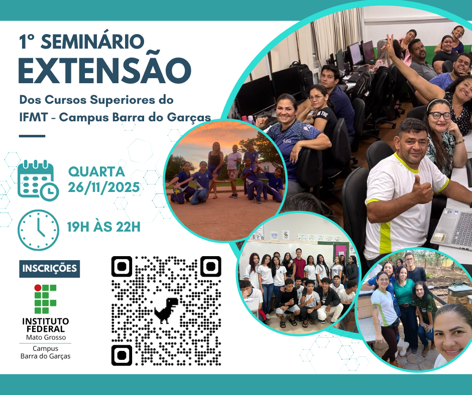 O IFMT Campus Barra do Garças convida toda a comunidade acadêmica para o 1º Seminário de Extensão dos Cursos Superiores, que ocorrerá no dia 26 de novembro de 2025, das 19h às 22h.
