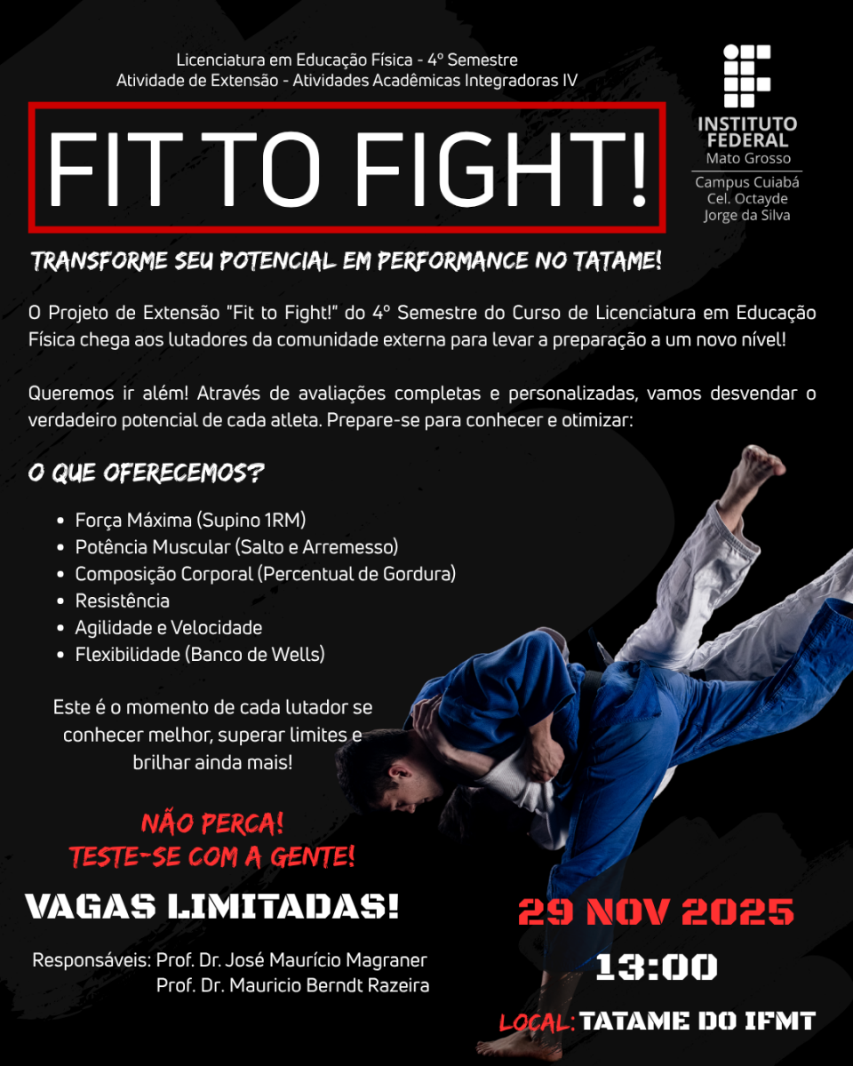 O Instituto Federal de Mato Grosso (IFMT) Campus Cuiabá Cel. Octayde Jorge da Silva sediará uma ação de avaliação física detalhada como parte do projeto de extensão "Fit to Fight!". O evento ocorrerá no dia 29 de novembro de 2025, sábado, entre as 13h e 17h.