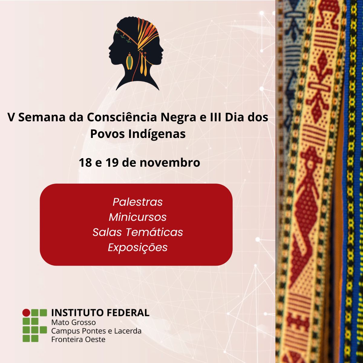 O evento, que ocorrerá no IFMT - Pontes e Lacerda nos dias 18 e 19/11, celebrará o Dia da Consciência Negra e o Dia dos Povos Indígenas, destacando a importância das leis 10.639/2003 e 11.645/2011. A programação incluirá palestras, minicursos, salas temáticas e exposições voltadas para a valorização da cultura afro-brasileira e indígena, com participação da comunidade interna e externa ao campus. O objetivo é promover o respeito à diversidade e fortalecer o entendimento sobre a história e os direitos dessas populações
