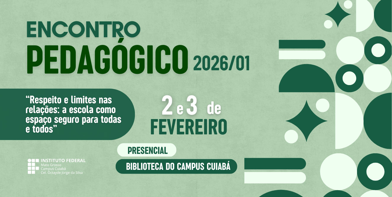 Os Encontros Pedagógicos no IFMT são previstos em Calendário Acadêmico para acontecerem no início de cada ano/semestre letivo, com o objetivo de proporcionar aos profissionais da educação um momento para planejamento das atividades didático-pedagógicas e também oportunizar momentos coletivos de aprendizagem e formação continuada aos servidores e servidoras envolvidos diretamente nas ações pedagógicas deste Campus Cuiabá. Neste semestre, o Encontro Pedagógico 2026/1 será realizado nos dias 02 e 03 de fevereiro de 2026, na modalidade presencial, na Biblioteca do Campus Cuiabá.
