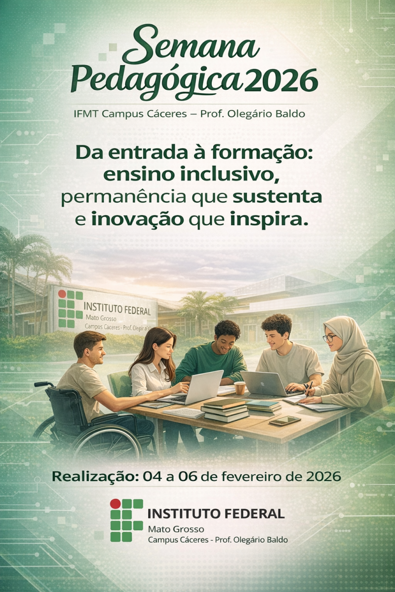 A Semana Pedagógica 2026 do IFMT Campus Cáceres, com o tema “Da Entrada à Formação: Ensino Inclusivo, Permanência que sustenta e Inovação que Inspira”, ocorre de 04 a 06 de fevereiro e reúne gestores, docentes e equipe pedagógica em momentos de planejamento, formação e debate sobre ensino, inclusão e permanência estudantil. Ao longo dos três dias, a programação contempla abertura institucional, organização do semestre (horários, salas e documentos acadêmicos), formações sobre uso de inteligência artificial e plataforma Solis, discussão do regulamento disciplinar discente, diálogos com a PROEN sobre melhoria do ensino e permanência, além de palestras sobre o papel do Conselho Tutelar e sobre o PEI e o Atendimento Educacional Especializado no campus.