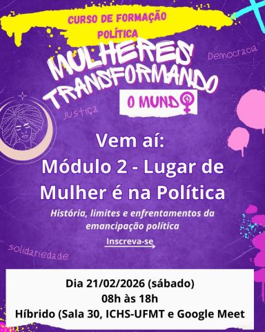 O curso Lugar de Mulher é na Política, organizado pelo Laboratório Nenhuma a Menos: Teorias e Práticas Feministas e Antirracistas no Enfrentamento das Violências contra Mulheres e Meninas em Mato Grosso (IFMT / UFMT).